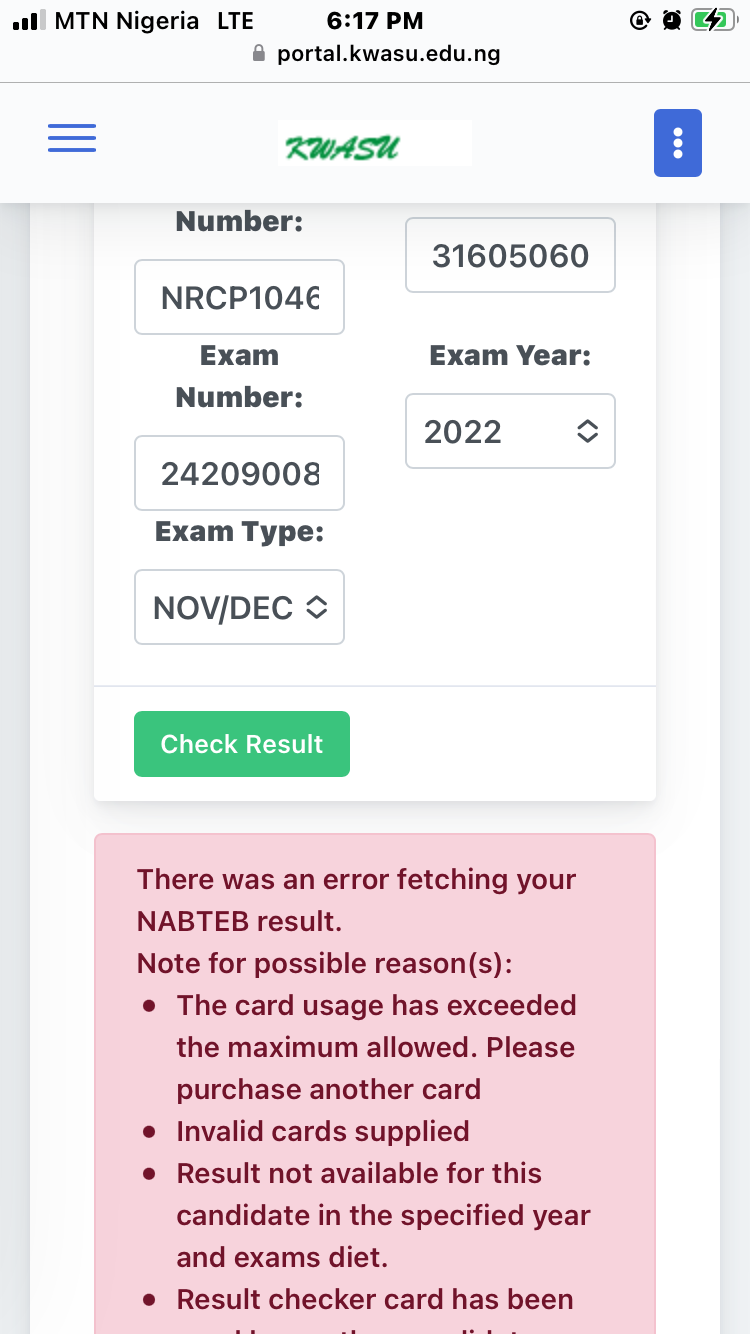 Good morning sir, Pls what is wrong with Nabteb result checking portal, i tried checking my result, the portal wasn’t going, I even tried supplying my Scratch card pin to my Kwasu’s undergraduates pre admission screening portal for verification, it’s not going and I even bought another pin, same thing