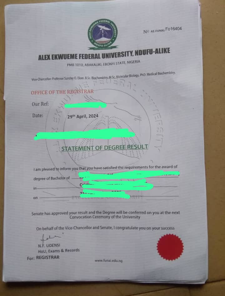 A Statement of Result is a temporary document issued by educational institutions to confirm that a student has successfully completed their program of study. It serves as proof of graduation while the official certificate or diploma is being prepared.