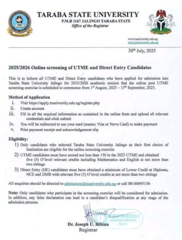 This is to inform all UTME and Direct Entry candidates who applied for admission into Taraba State University, Jalingo for the 2025/2026 academic session that the online Post-UTME screening exercise will hold from 1st August to 15th September, 2025.
