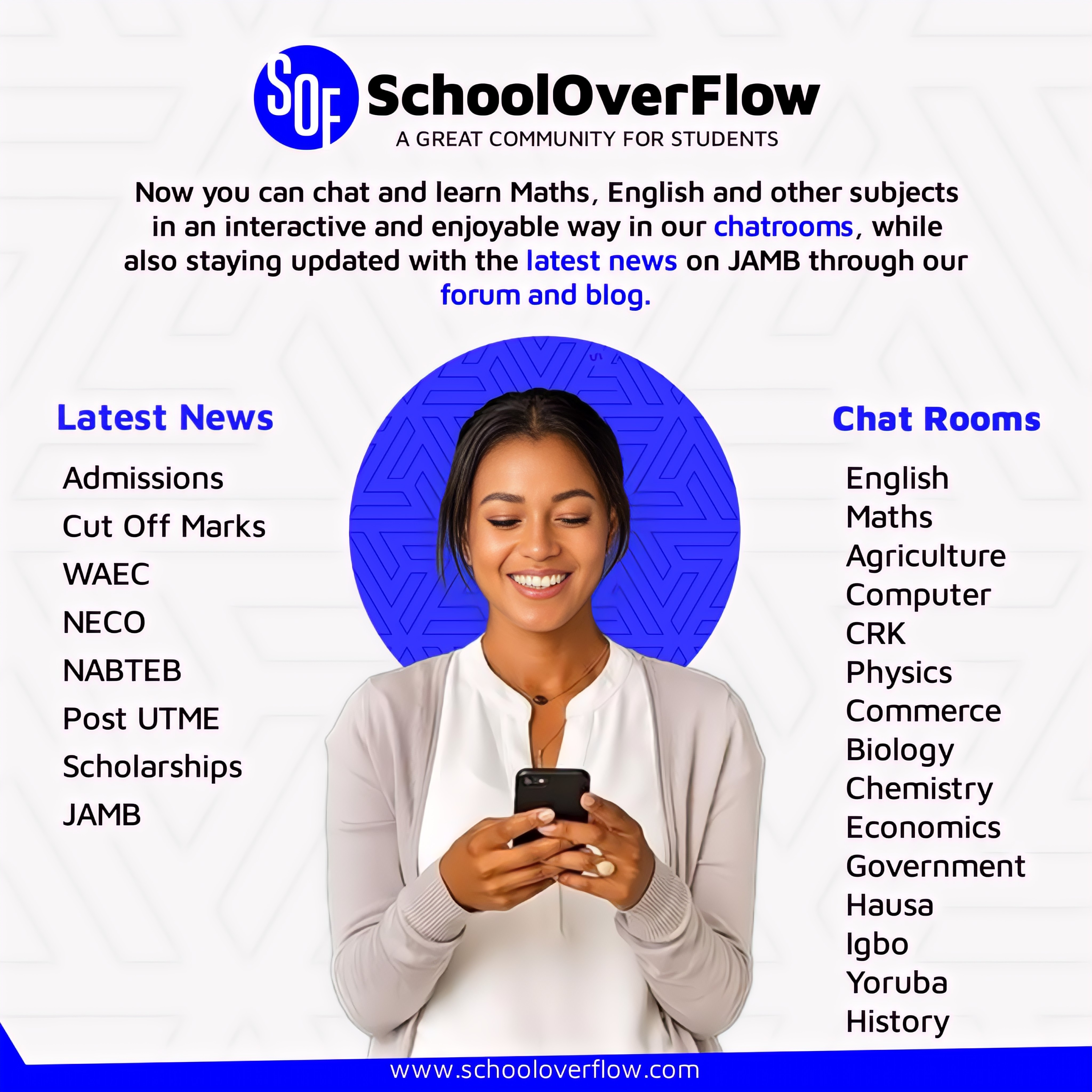 SchoolOverflow is the go-to app for students seeking to boost their learning experience. Engage in interactive chatrooms for Maths, English, and other subjects, and stay updated with the latest news on JAMB, cut-off marks, admissions, WAEC, GCE, NECO, NABTEB, PUTME, and scholarships through the app’s forum and blog. It’s a comprehensive platform for both academic support and essential educational updates.