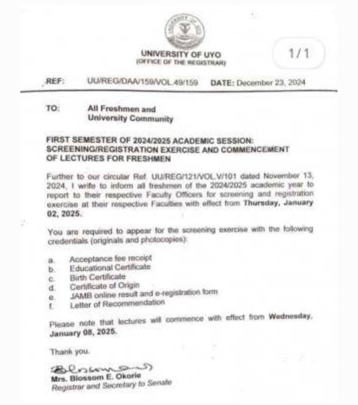 The University of Uyo (UNIUYO) has announced the schedule for the screening, registration, and commencement of lectures for newly admitted students for the 2024/2025 academic session.