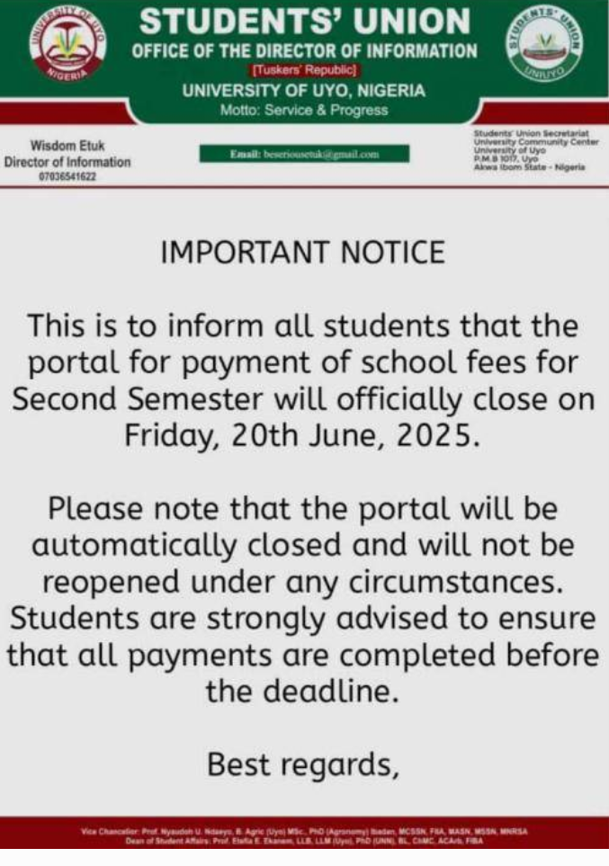 The Students’ Union Government (SUG) of the University of Uyo (UNIUYO) has officially announced that the payment portal for Second Semester school fees will be shut down on Friday, 20th June, 2025.