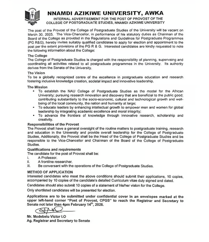 Nnamdi Azikiwe University (UNIZIK) is seeking applications for the position of Provost, College of Postgraduate Studies. The role involves oversight of postgraduate training, research, and administration.