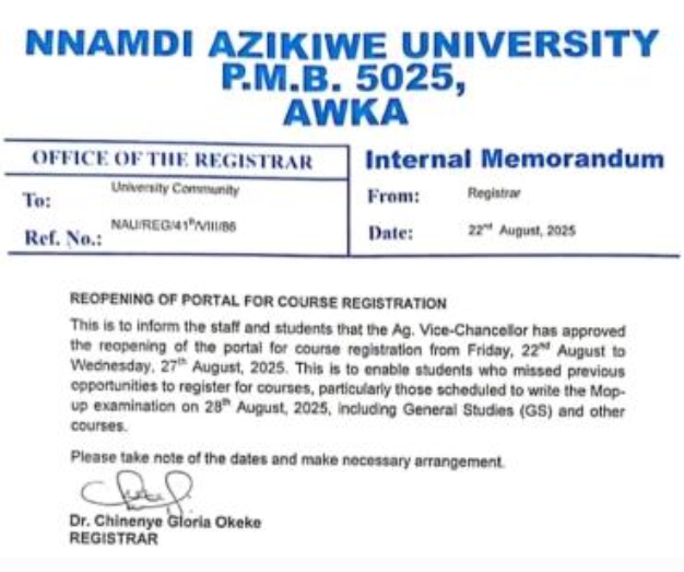 The management of Nnamdi Azikiwe University (UNIZIK), Awka, has announced the reopening of the university’s course registration portal.