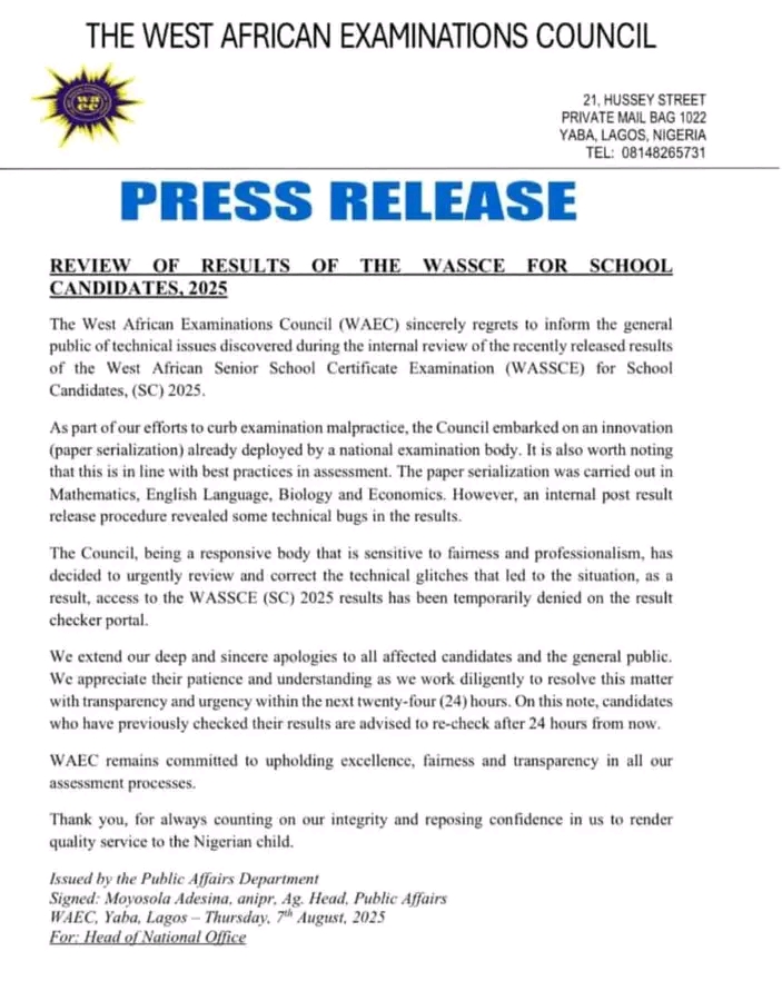 According to a statement issued on Thursday, August 7th, 2025, by Moyosola Adesina, Ag. Head of Public Affairs, WAEC discovered technical issues during an internal review process after the release of the results.