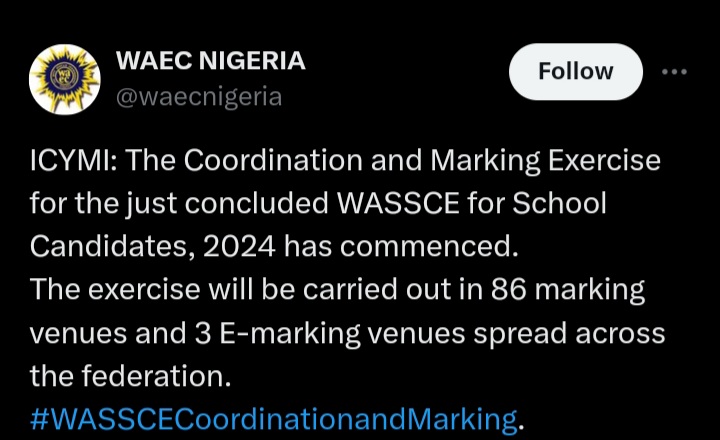 The coordination and marking exercise for the 2024 May/June West African Senior School Certificate Examination (WASSCE) has commenced The West African Examinations Council (WAEC) announced this via its X handle (formerly known as Twitter) According to WAEC, the exercise will be carried out in 86 marking venues and 3 e-marking venues in Nigeria.