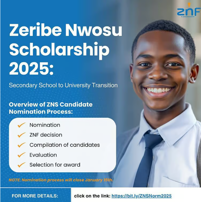 The Zeribe Nwosu Foundation is inviting volunteers to assist with the nomination process for the 2025 Secondary School to University Transition Scholarship. This initiative supports secondary school students transitioning to university by covering WAEC, NECO, or JAMB fees. Nominate a public school today to make a difference in students’ lives.